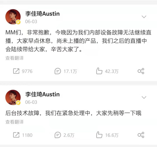 6月3日,正在进行的李佳琦直播间突然中断。随即,李佳琦发微博解释称后台出现技术故障。一天后,李佳琦接下来几天的直播预告消失,淘宝也下架了李佳琦直播间的入口。