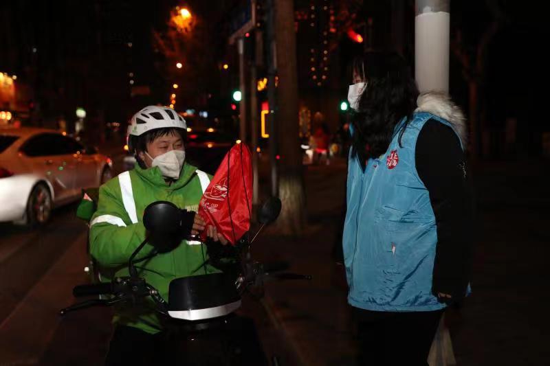 在汇暻生活广场主会场和8号桥四期、歌斐中心、裕兴大厦3个分会场,来自企事业单位的志愿者们将这500多份“冬日暖心包”送给了饿了么、美团的外卖小哥,以及环卫工人和物业工作人员等,感谢他们一年来始终默默为这座城市在奋斗,为市民不计回报的奔波和付出。礼包含有定制口罩、消毒液、暖宝宝、连花清瘟、冬季手套等,多重温暖交织在一起,希望可以为一线劳动者们在数九寒冬中保驾护航。