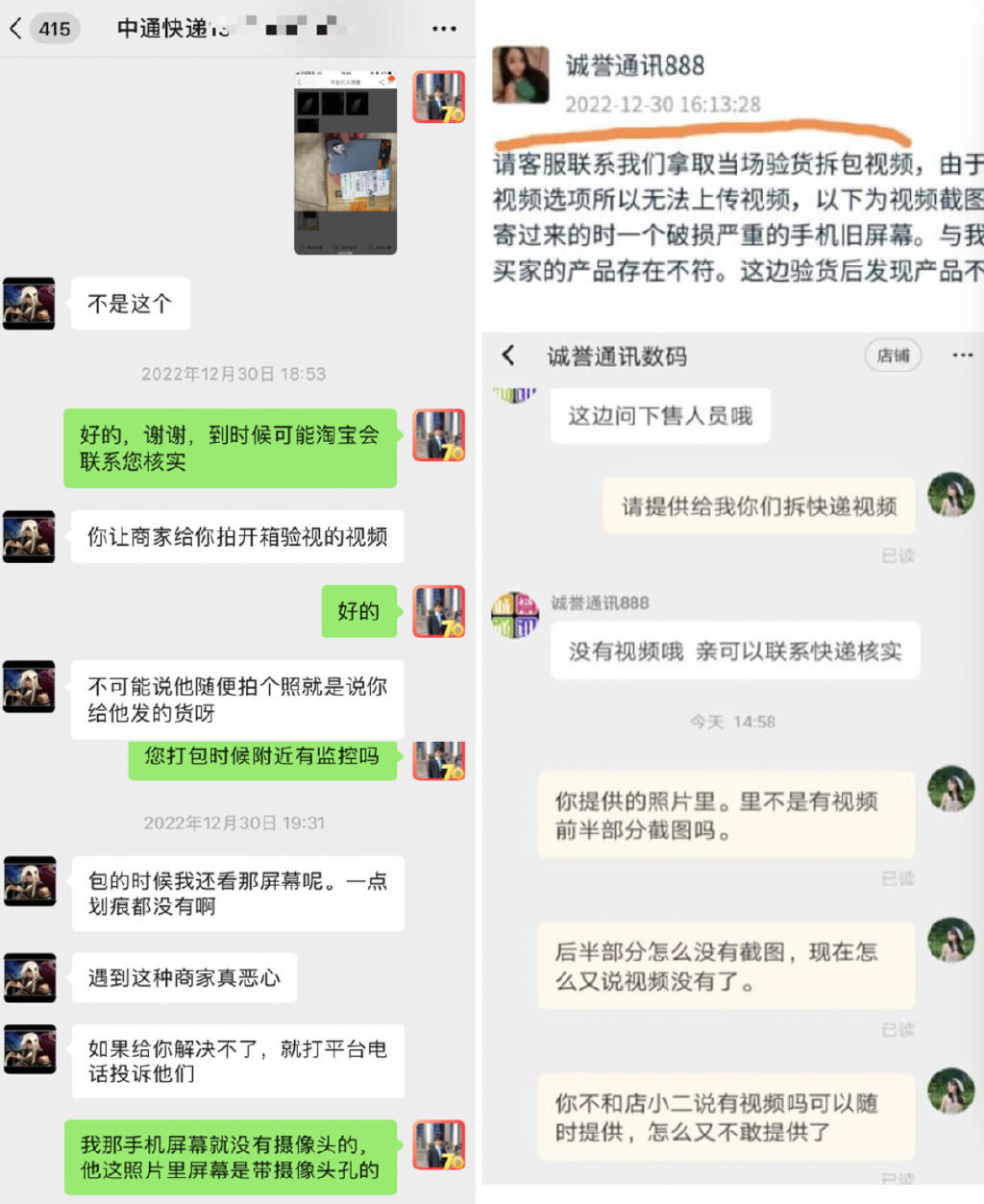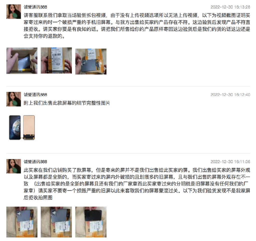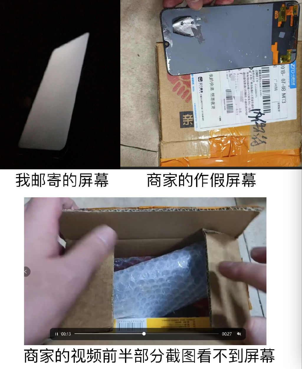 先简单说下事情经过,小编在某宝买了一款手机屏幕。由于安装后黑屏就申请退款,商家刚开始不同意,后来同意退货检测。由于小编没有包装盒给快递员打包费让其重新包装。等快递退到商家仓库,商家进行电话辱骂声称非其屏幕并拒收。于是申请某宝介入,商家提供拆快递视频的前半部分截图和随便拿个破屏幕对着快递单拍照,我这提供快递员的证词请某宝核实,并让商家提供完整拆快递视频。某宝没有和快递核实,没有要商家视频,直接判断商家有效。