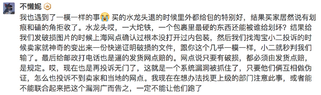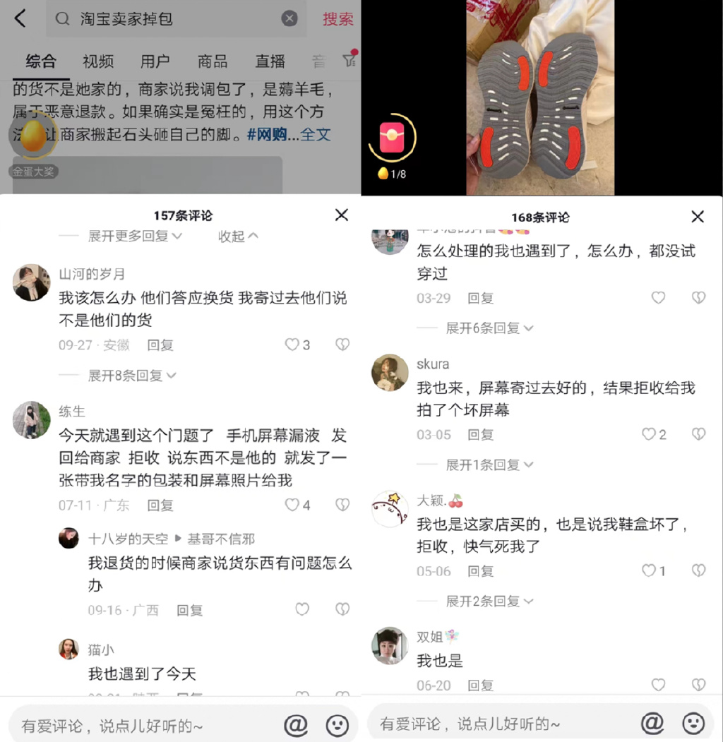 全网到处都是某宝投诉的视频和文章。由于平台纵容,商家掉包业务也越来越熟练了。希望某宝不要在这条路上越走越远,失去用户,失去人心!我们大家联合维权起来,如果你也遇到了这类事件可以留言评论或私信小编提供纪录,小编来操作投诉某宝平台,直至关闭欺骗消费者权益店铺,还消费者一个健康的购物平台!