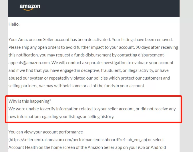 亚马逊在邮件中并未告知卖家具体的封禁原因,只是很笼统的说了一句:“我们无法核实有关卖方帐户的信息,或没有收到任何关于您的商品上架或销售历史的新信息。”侃哥发现这封邮件以及卖家申诉被亚马逊秒拒的情况,和昨天我们文章里提到的情况非常相似,当时业内人士推测亚马逊是在重点清理占着坑位不卖货的新账号。