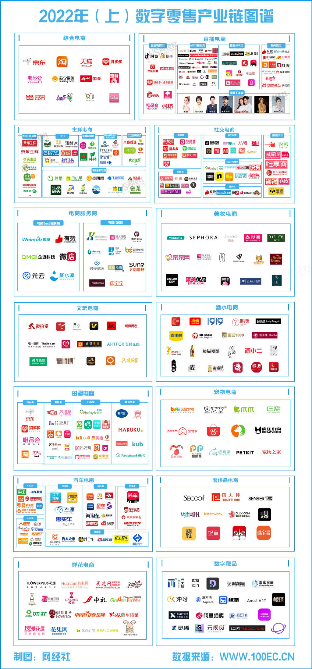 (1)综合电商:京东、淘宝、天猫、拼多多、苏宁易购、国美真快乐、唯品会、当当、i百联、哔哩购等;