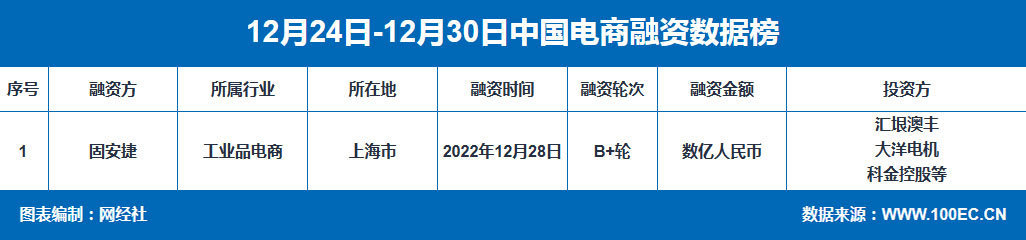 据网经社“电数宝”电商大数据库(DATA.100EC.CN)监测显示,截至目前,十二月第四周各电商领域的投融资事件为1起,总融资额约为数亿元(币种:人民币),涉及的平台为:固安捷。