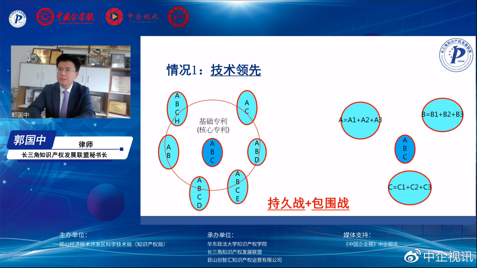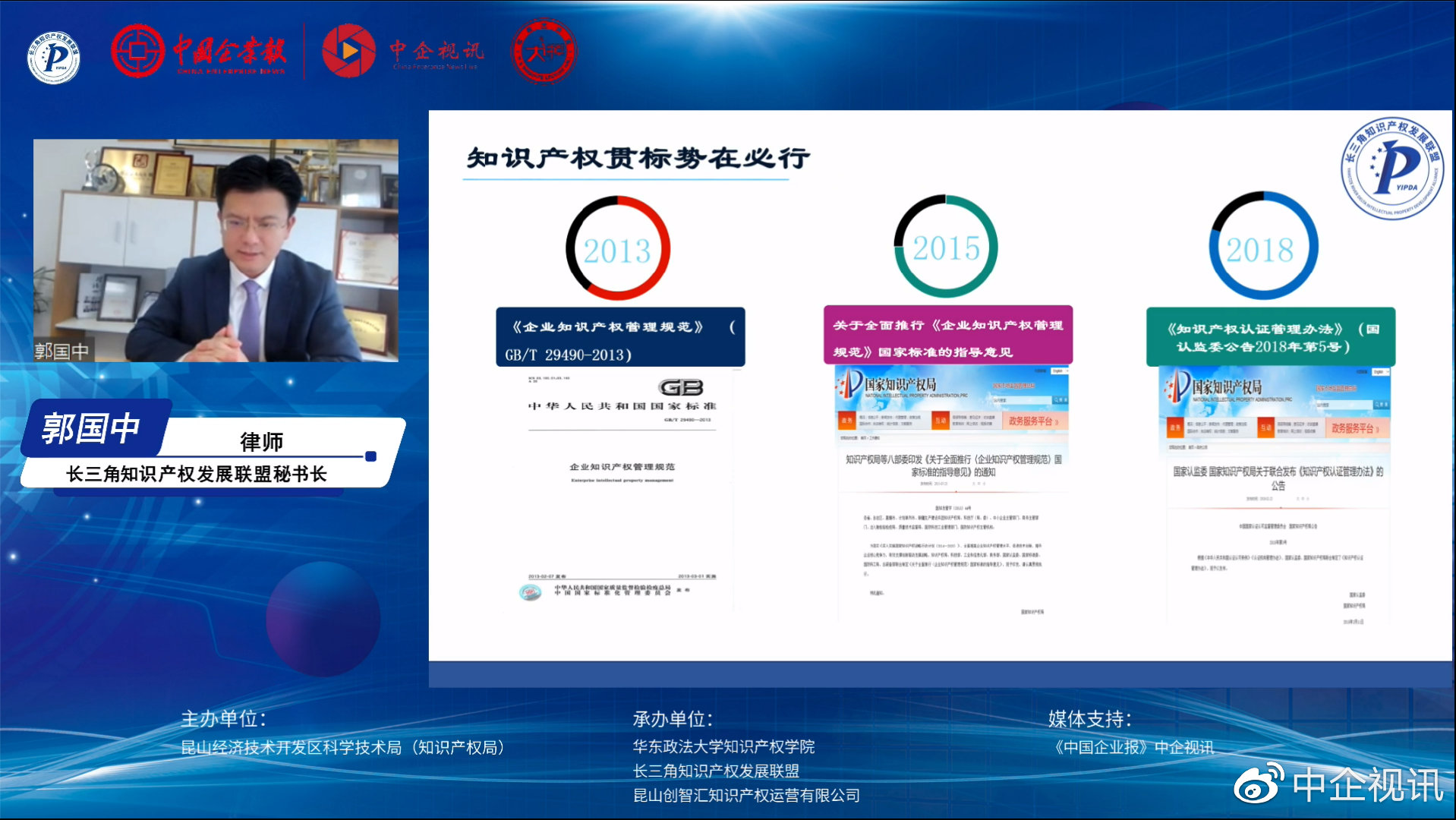 12月30日下午,由昆山经济技术开发区科学技术局(知识产权局)主办,华东政法大学知识产权学院、长三角知识产权发展联盟、昆山创智汇知识产权运营有限公司承办的2022年度昆山开发区知识产权高级研修班在《中国企业报》中企视讯《知新大讲堂》频道成功开讲。长三角知识产权发展联盟秘书长、上海段和段律师事务所知识产权中心主任郭国中精讲了企业知识产权标准化管理实务策略与案例。