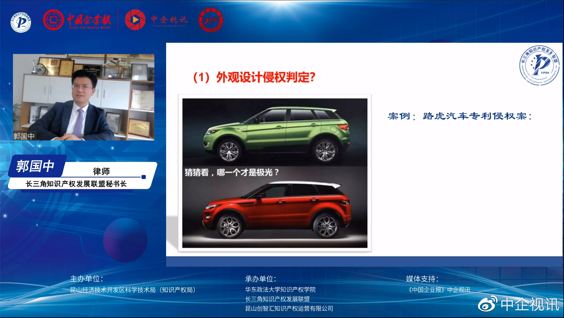 如何判断专利是否侵权?郭国中表示,发明或实用新型专利以全面覆盖原则(全包括原则)为判断依据,外观设计专利则以整体判定原则(整体相似即侵权)为判断依据,通过路虎汽车外观设计侵权案,郭国中建议企业知识产权先行,市场推广在后。