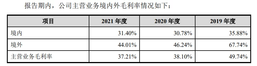 具体来看,2019-2021年,绿联科技境内毛利率分别为35.88%、30.78%和31.40%;同期境外毛利率则分别为67.74%、46.24%和44.01%。境外毛利率高企也提升了绿联科技主营业务的整体毛利率。