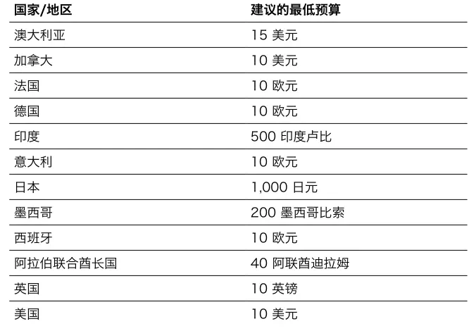 针对以下国家/地区,官方给出了相应的建议每日最低预算: