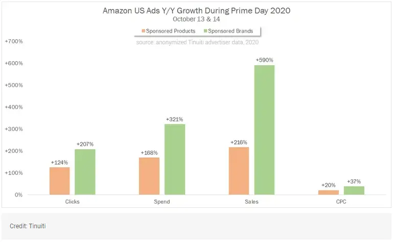 而在亚马逊表现方面,据Tinuiti统计的一项数据显示,在10月13日和14日的两天活动中,商品推广带来的销售额同比增长了207%,品牌推广的带来销售额同比增长了590%。其中,品牌视频推广发挥了关键作用,在所有使用品牌推广的卖家中,有近20%的卖家利用视频推广进行促销。
