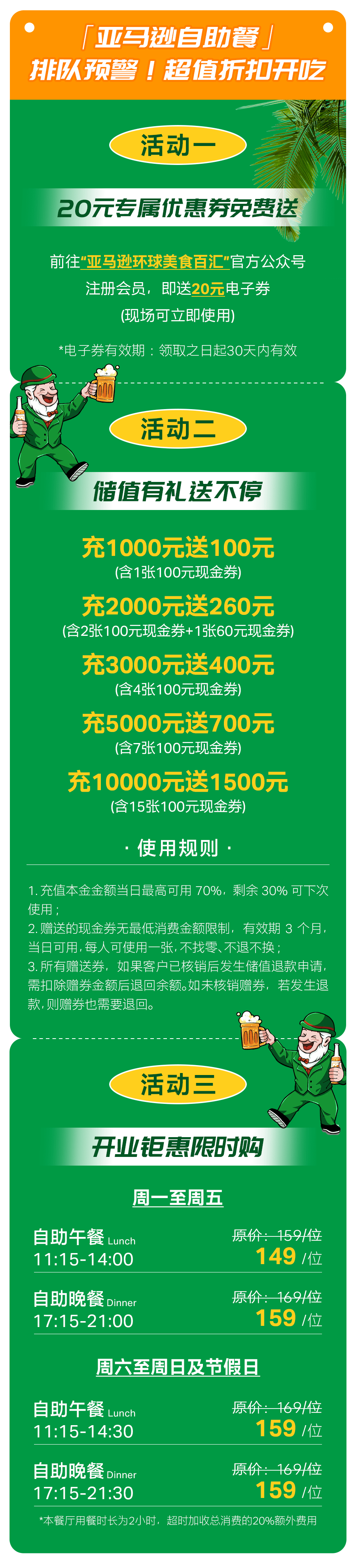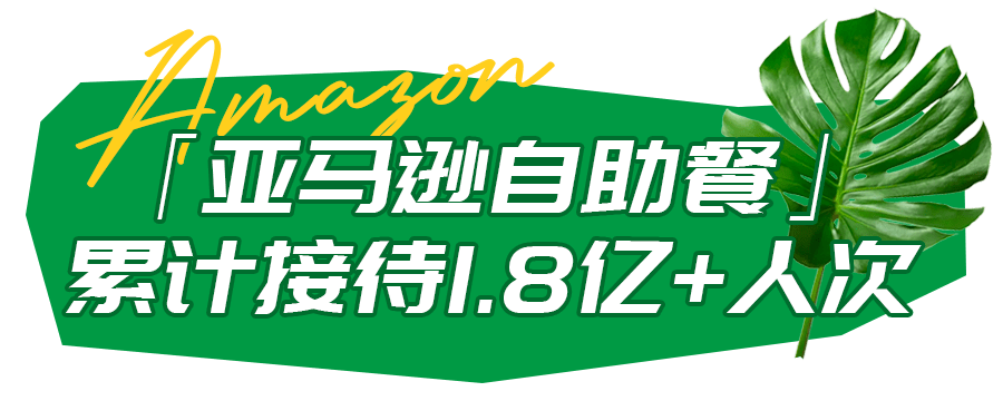 亚马逊自助餐在店内每一处都注入了独特的感官体验,以充满热带雨林气息的绿作为底色,搭配原始感的黄,用视觉演绎新鲜活力, 重新定义潮人社交聚会圣地。
