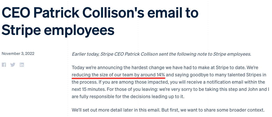 周四,线上支付巨头Stripe的CEO在给员工的公开信总表示,公司将裁员15%,约1100人。比较恐怖的是,被“毕业”的员工,将在15分钟内受到通知邮件,不留一点余地。