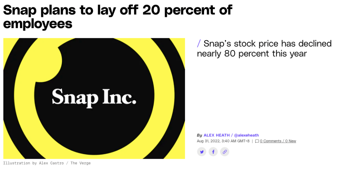 其它“中小厂”的日子更不好过:Lyft宣布裁员13%、Snap裁员20%、Robinson裁员23%、Coinbase裁员18%、Chime裁员12%,房地产公司房地产公司Zillow、Opendoor等也纷纷裁员……