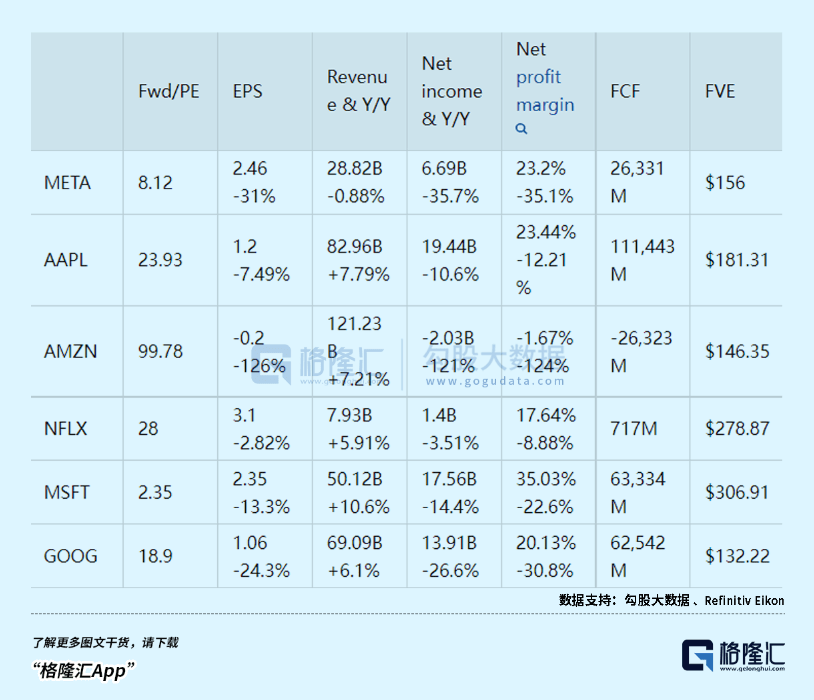 最惨的是Meta,是杀逻辑,这个是没有底的。营收连续环比下降,净利润同比降52%,连续四个季度利润下降,远低于市场预期,且在加速。