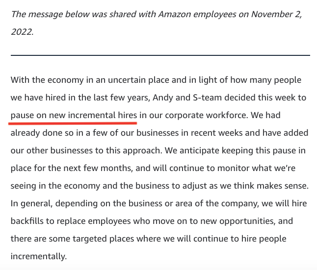 周二,亚马逊发出公告,鉴于当前经济不稳定,预计在未来几个月将持续冻结招聘。同时,据亚马逊员工爆料,公司内部已经有小规模裁员行动。