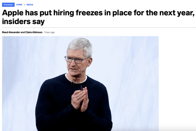 苹果公司称,已暂停招聘研发部门以外的许多职位,且到2023年9月间不再招人,目前已经解散了几百人的招聘团队。公司声明称,鉴于现行经济环境采取了“慎重的做法”,从而希望“长期推动创新”。