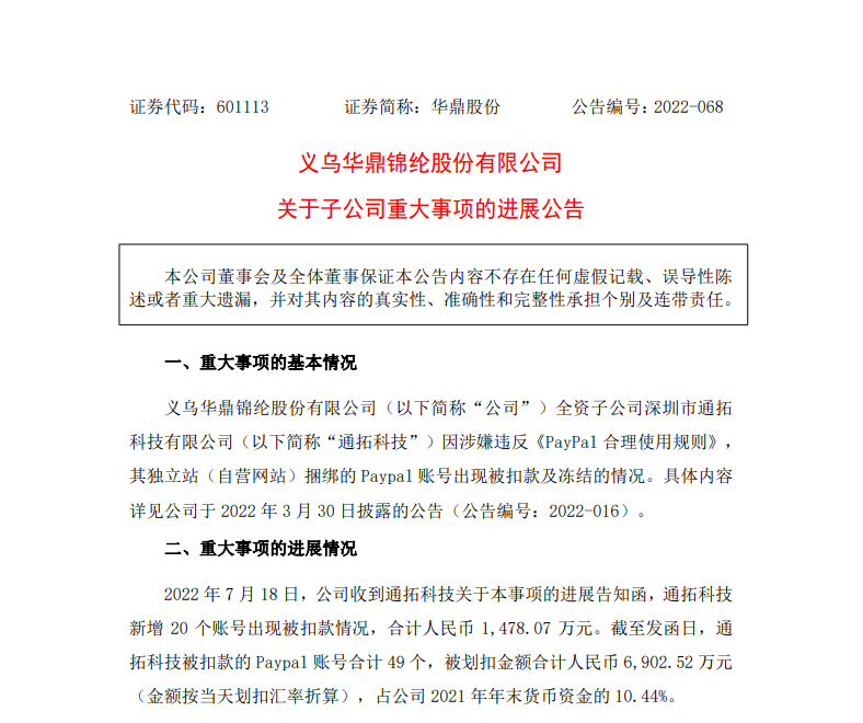 公告显示,7月18日,华鼎股份收到通拓科技的进展告知函,通拓科技新增20个账号出现被扣款情况,合计1478.07万元。截至发函日,通拓科技被扣款的Paypal账号合计49个,被划扣金额合计6902.52万元(金额按当天划扣汇率折算)。