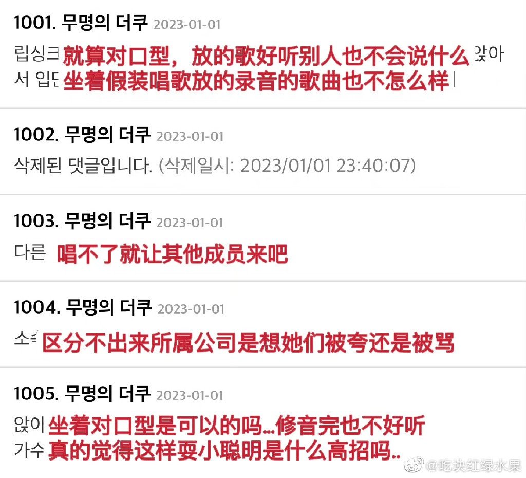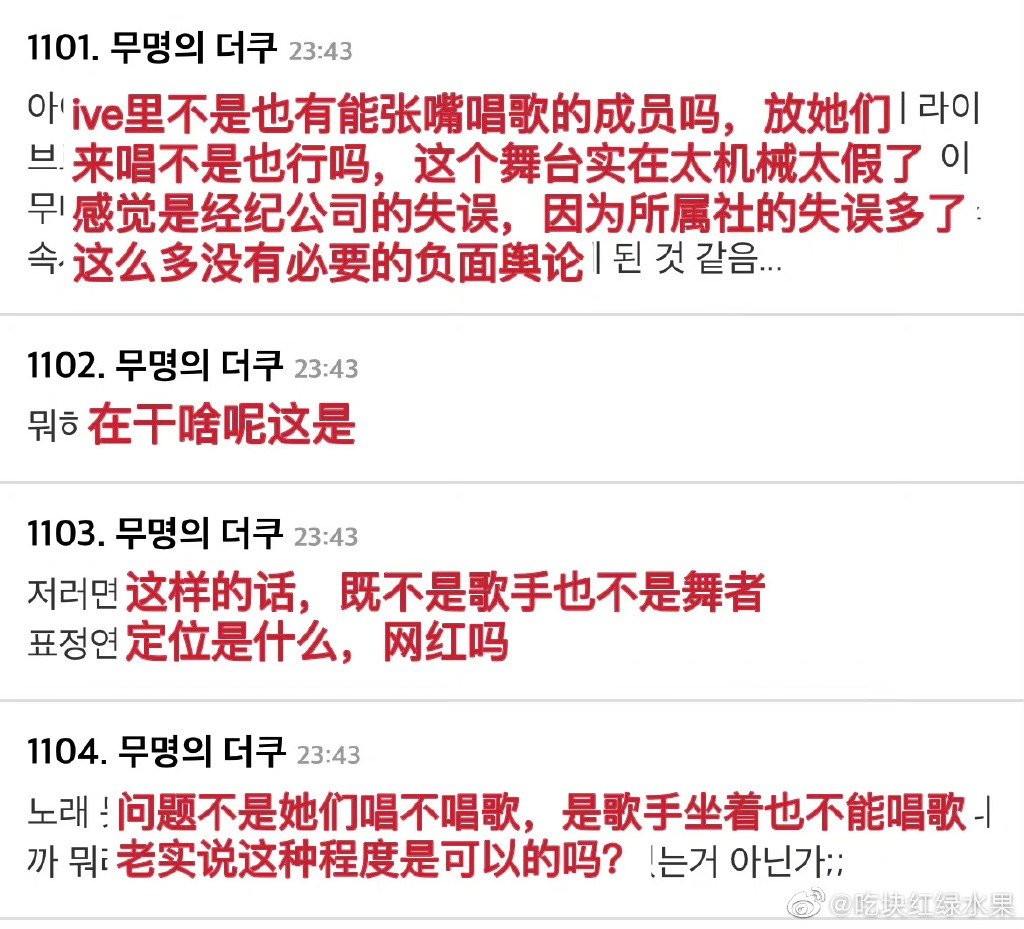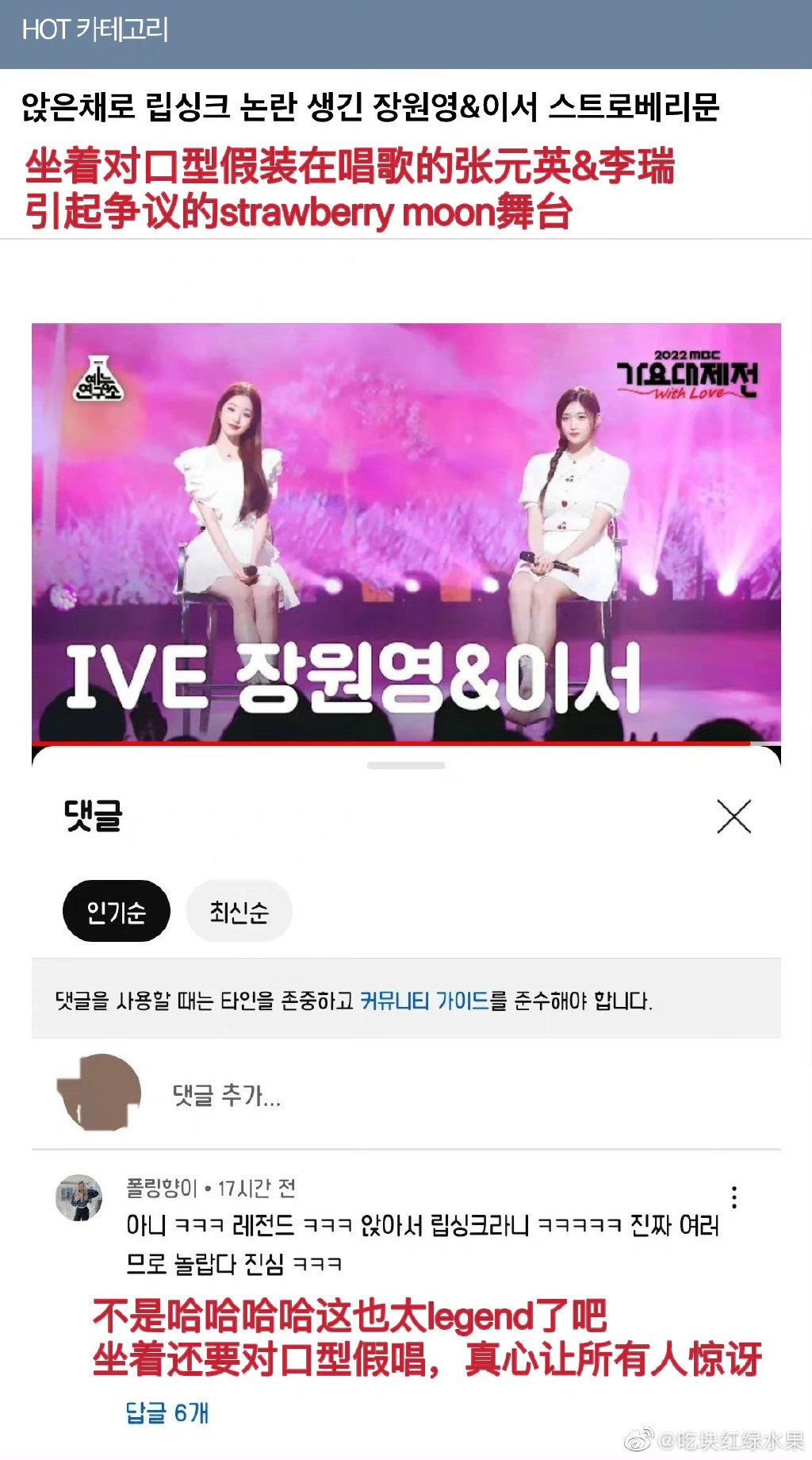 讽刺的是,IVE的粉丝一开始还以为自己爱豆是唱得太好,所以被误会是假唱,于是在事情刚发生的时候,各种刷屏和发帖表示,IVE张元英和李瑞的唱功太好,被喷子认为是对嘴假唱,结果IVE的舞台很快便被实锤坐桩对嘴假唱,首先话音不同步,其次便是此次年末舞台的音源,和此前IVE团综的版本一模一样,这就很尴尬了。