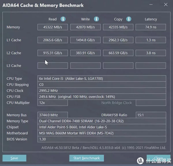 通过AIDA64进行测试对XMP到3000Mhz的金百达内存条进行测试,读取速度为45322MB/s,写入速度为42870MB/s,复制速度为42335MB/s,延迟74.9ns,时序为16-20-20-38,读写性能不错,在这个价位段可以说是真香了。
