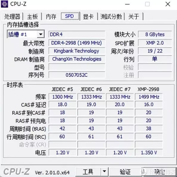在CPU-Z中可以看到制造商为Kingbank Technology,DRAM制造商为ChangXin Tecnologies,XPM超频之后频率为3000Mhz,电压为1.35V。