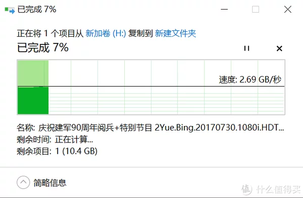 写入速度:拷入11G多的视频,平均写入速度为1.21GB/秒。