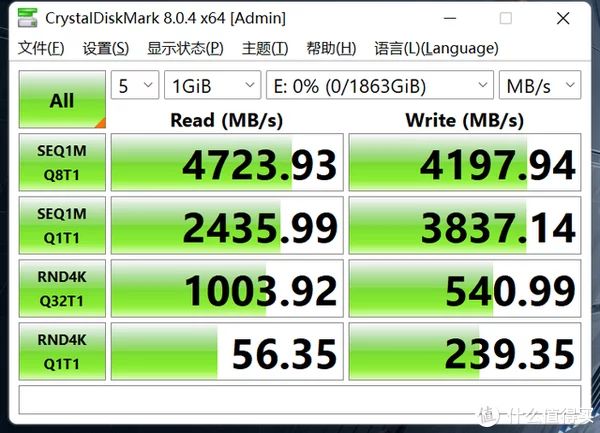 aigo P5000 2T版本固态硬盘速度标称是5000MB/s读取速度,我通过CrystalDiskMark测得顺序读取速度是4723MB/s、顺序写入速度4197MB/s,和标称的5000MB/s是十分接近的。倒是让我比较惊喜的是,4K随机和4K多线程的速度也很稳,2GB的DRAM发挥了很重要的作用。