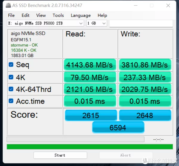 AS SSD BenchMark的速度一般都比上一个测速软件略低一些,但是结果也是接近标称性能的,大概在4143MB/s的读取速度、3810MB/s的写入速度。说实话,在5000MB/s的PCle 4.0硬盘之中,综合计算4K的得分取得6594分的硬盘,还是蛮少有的。