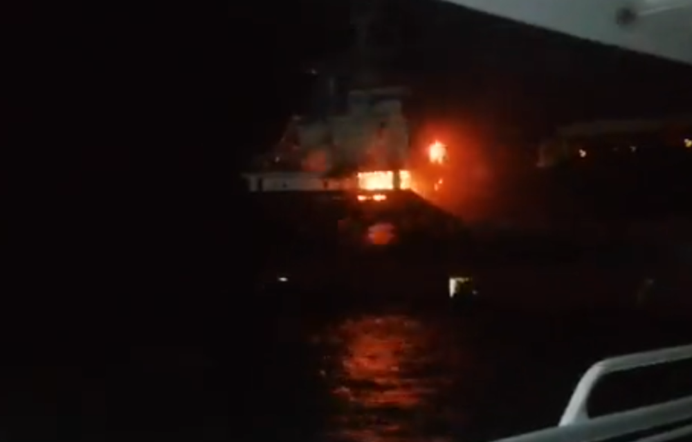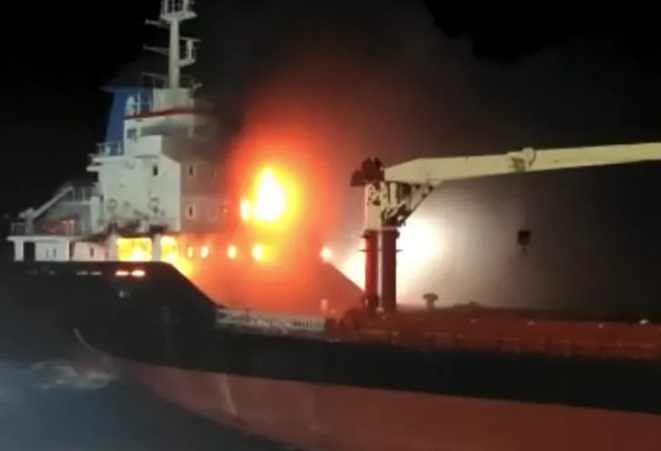 从土耳其海事总局在社交媒体上发布的视频上可以看出,当救援船到达时,海上正下着小雨,但依然不能阻挡船上熊熊燃烧的大火。