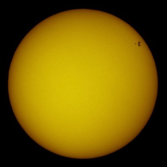 日盘右上角的暗斑并不是黑子。它们其实是国际太空站 (ISS)和正在执行STS-132任务的亚特兰提斯号航天飞机 (Atlantis)。在过往,许多观星人曾捕捉到类似亮星闪过晨昏天空的国际太空站和航天飞机;因为那时候位在地表200公里高处的这二个飞行体还沐浴在阳光中。而在上面影像中,天文摄影家Thierry Lagault经过精确计算后,找到记录这二艘快速移动的飞行体以黝黑剪影掠过日盘的时间点。他在2010年5月16日拍摄到上面这幅影像时,航天飞机再过50分钟就会泊靠在国际太空站。亚特兰提斯号这次升空运补国际太空站,将是它退伇前的最后任务。