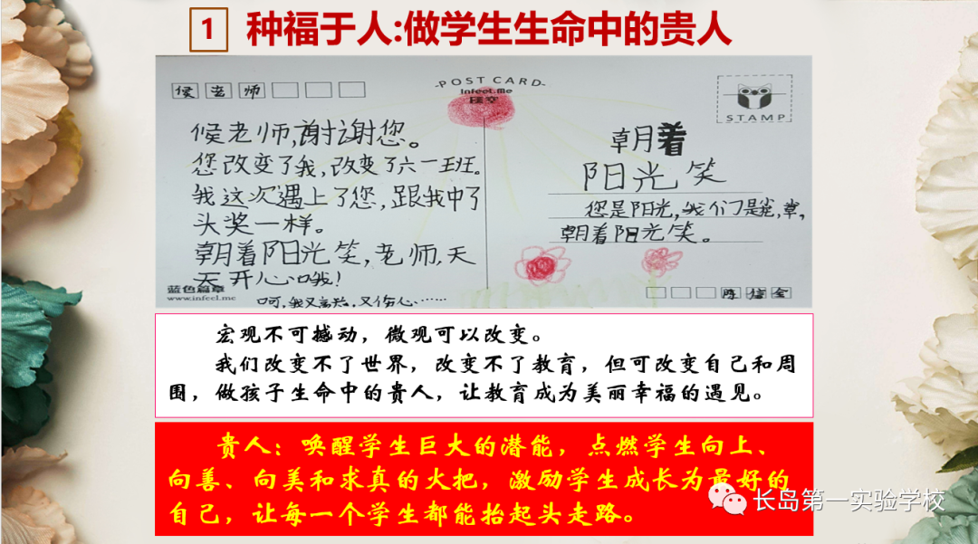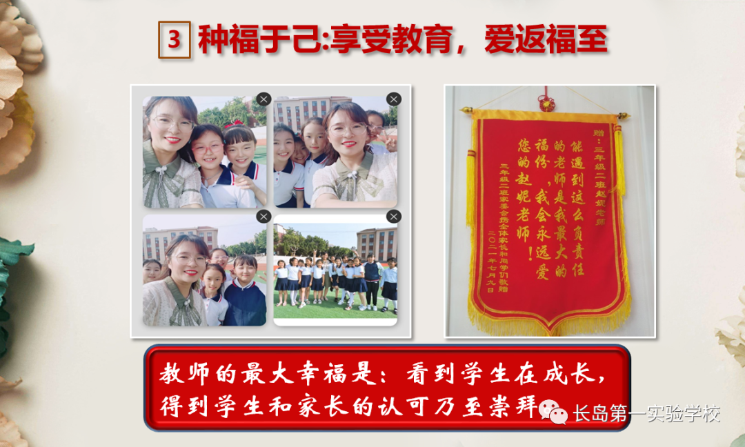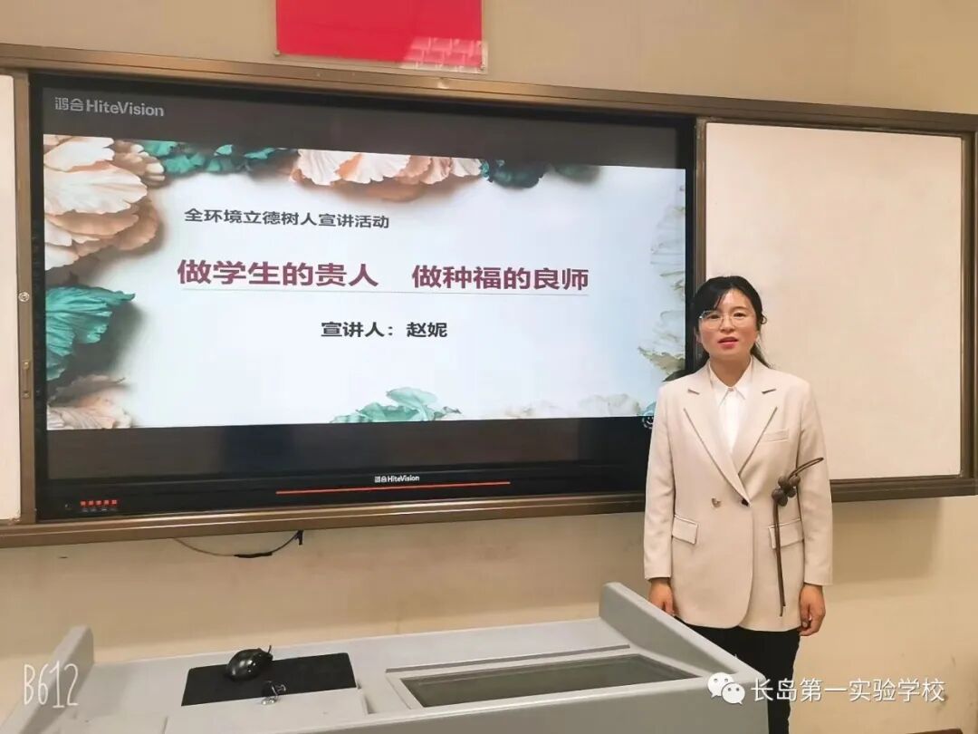 赵妮老师以“做学生的贵人 做种福的良师”为主题,结合自己的教学实践和工作经历,从“种福于人”、“种福于己”、“种福于国家”三个方面展开宣讲。