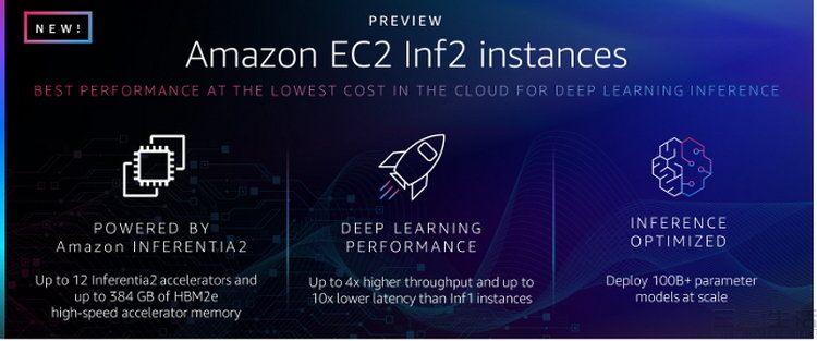 最后,针对机器学习推理场景,亚马逊云科技此次还发布了下代自研推理芯片Inferentia2,以及基于它的Amazon EC2 Inf2实例。与前代实例相比,新的实例吞吐量提升了4倍、延迟降低了90%,同时每瓦性能提高了45%。