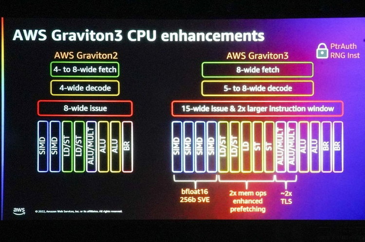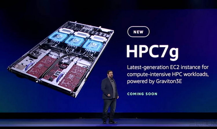其次,我们还迎来了Graviton3E,这也是亚马逊云科技自研高性能CPU家族的最新成员。根据官方公布的信息显示,它专门为浮点和向量指令运算进行了优化,在特定场景中能够带来35%的性能提升。