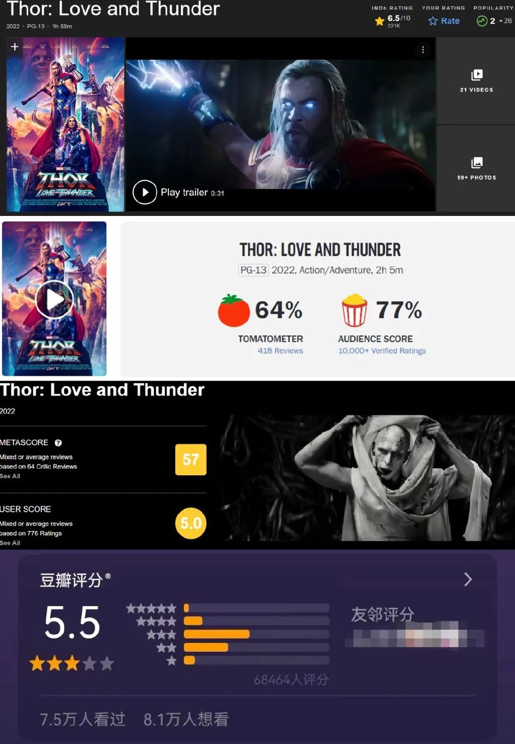 到了《雷神4》,IMDb 6.5分;烂番茄新鲜度仅64%,暂居MCU口碑倒数第二;