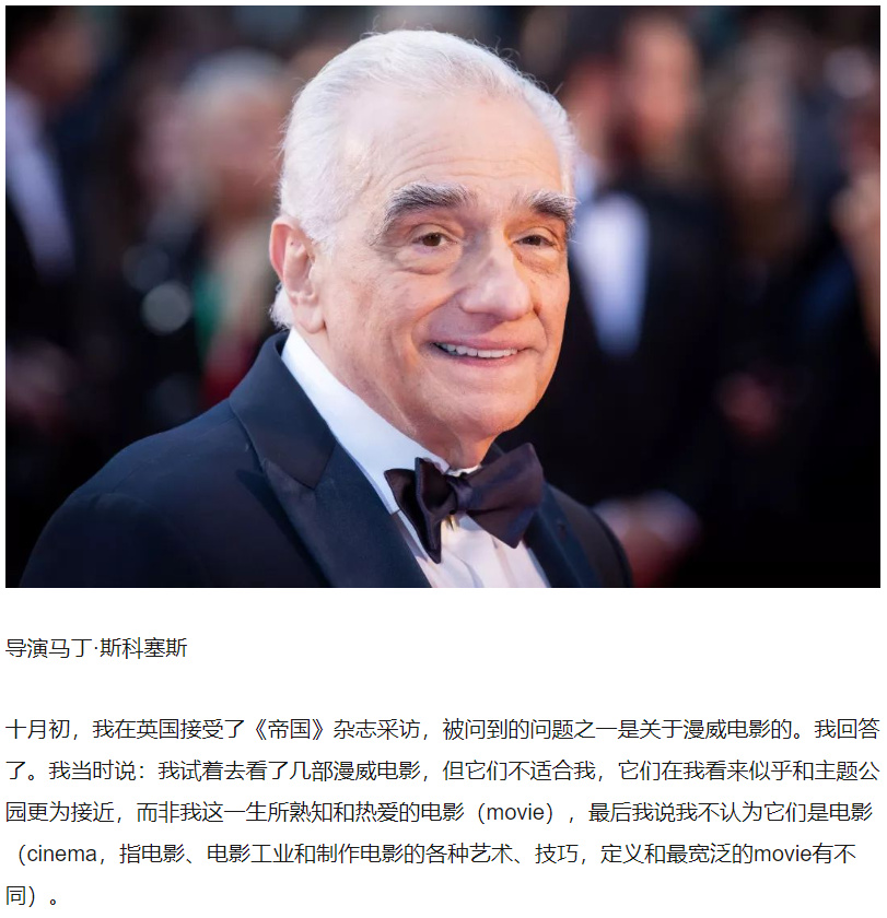 微博@守望好莱坞译马丁·斯科塞斯文《我说漫威电影不是电影,让我解释》