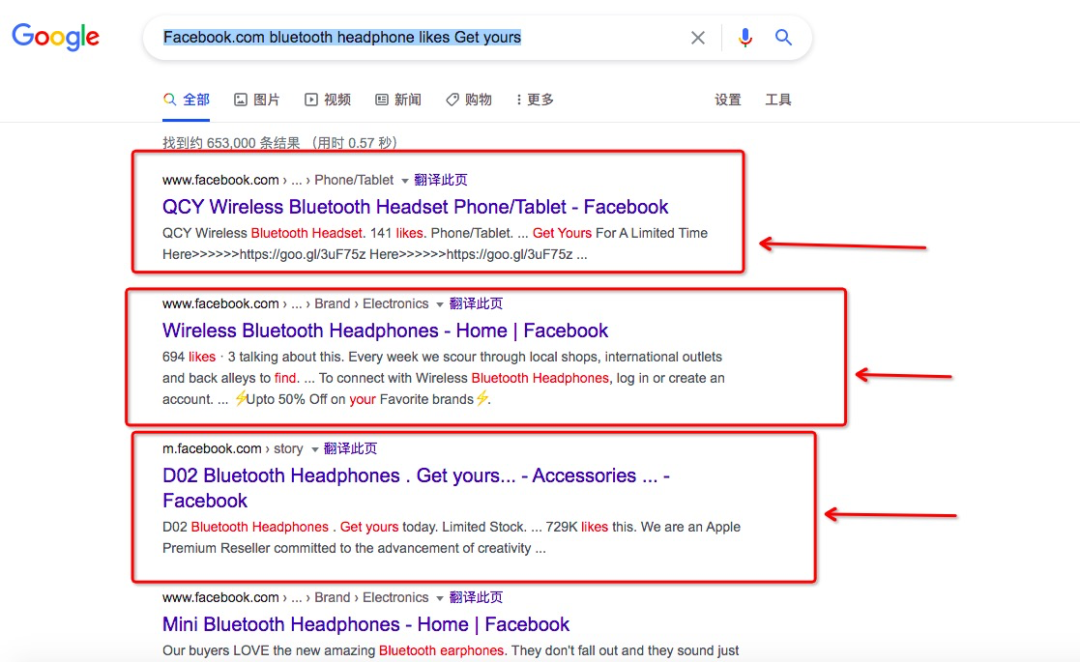 这样,我们就可以搜出很多相关产品的 Facebook 主页(如下图)。