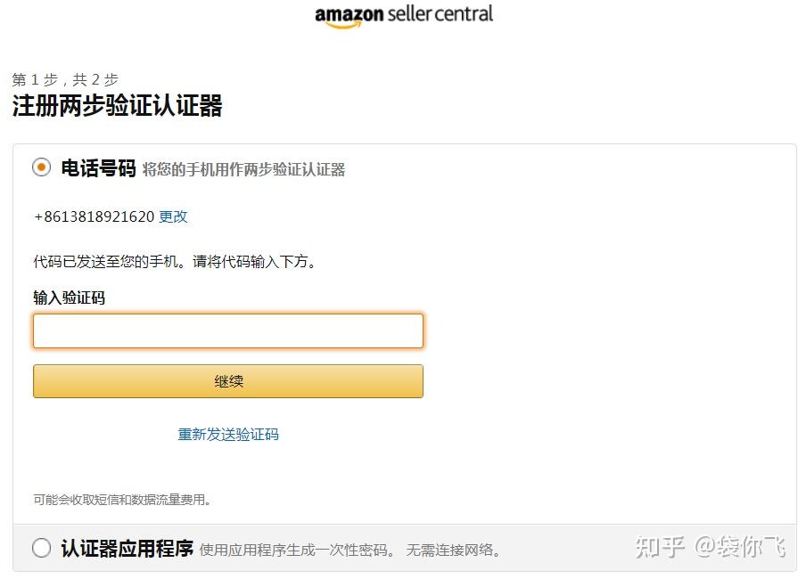 1. 选择电话号码方式后,输入用于两步验证的电话号码,并通过短信或者语音电话的方式进行验证。记得继续前要把电话前的国家改成自己所在的国家或地区(中国大陆卖家选择“中国+86〃)