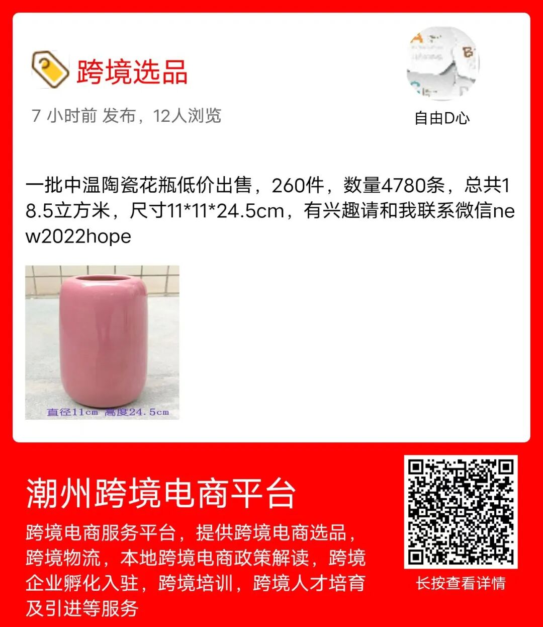 一批中温陶瓷花瓶低价出售,260件,数量4780条,总共18.5立方米,尺寸11*11*24.5cm,有兴趣请和我联系