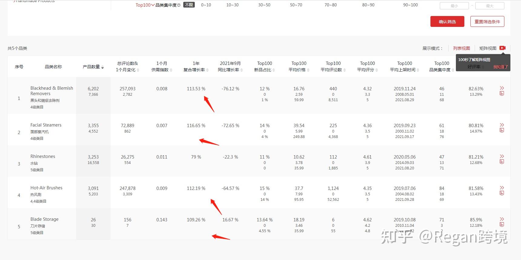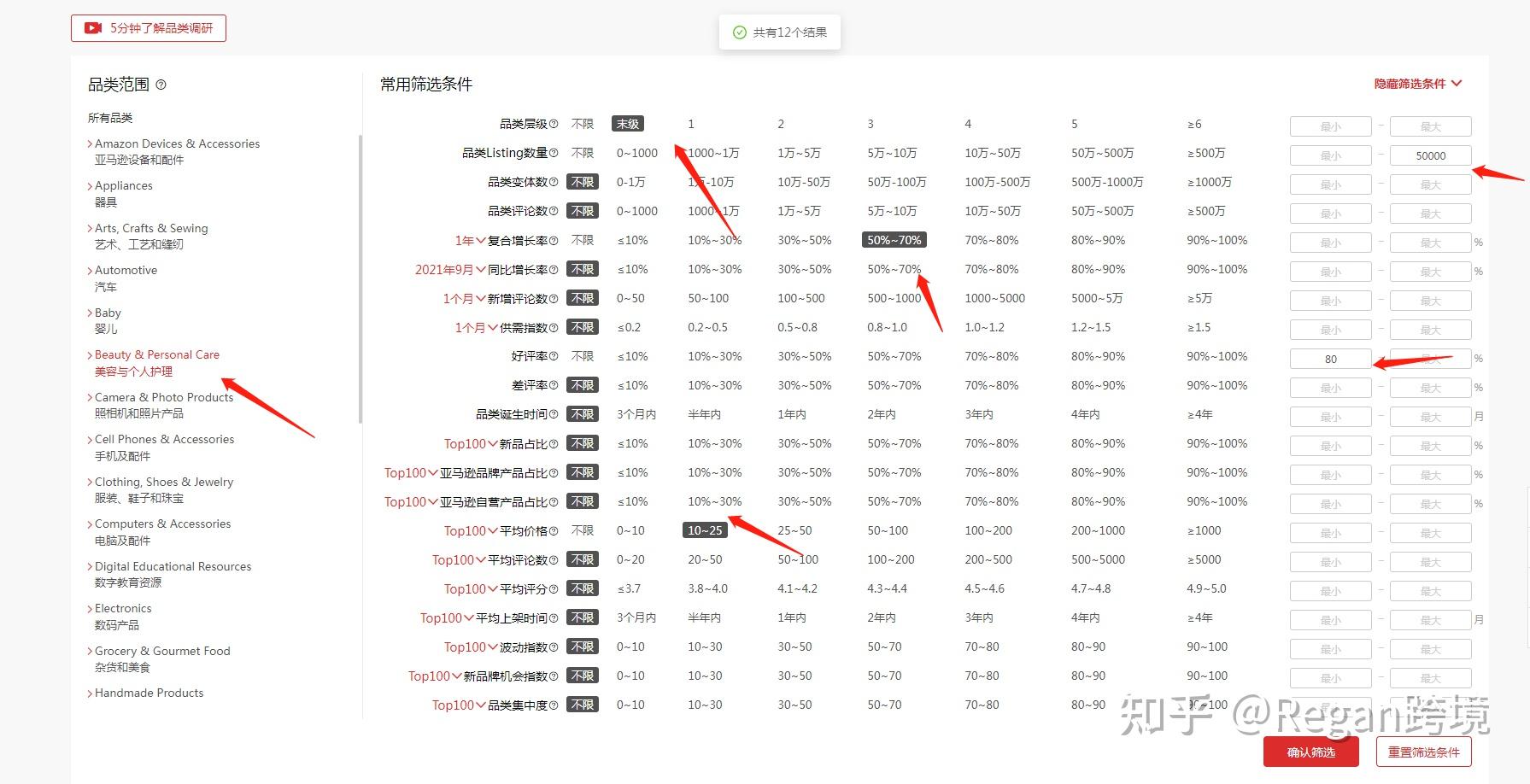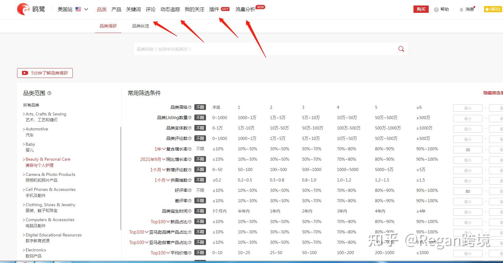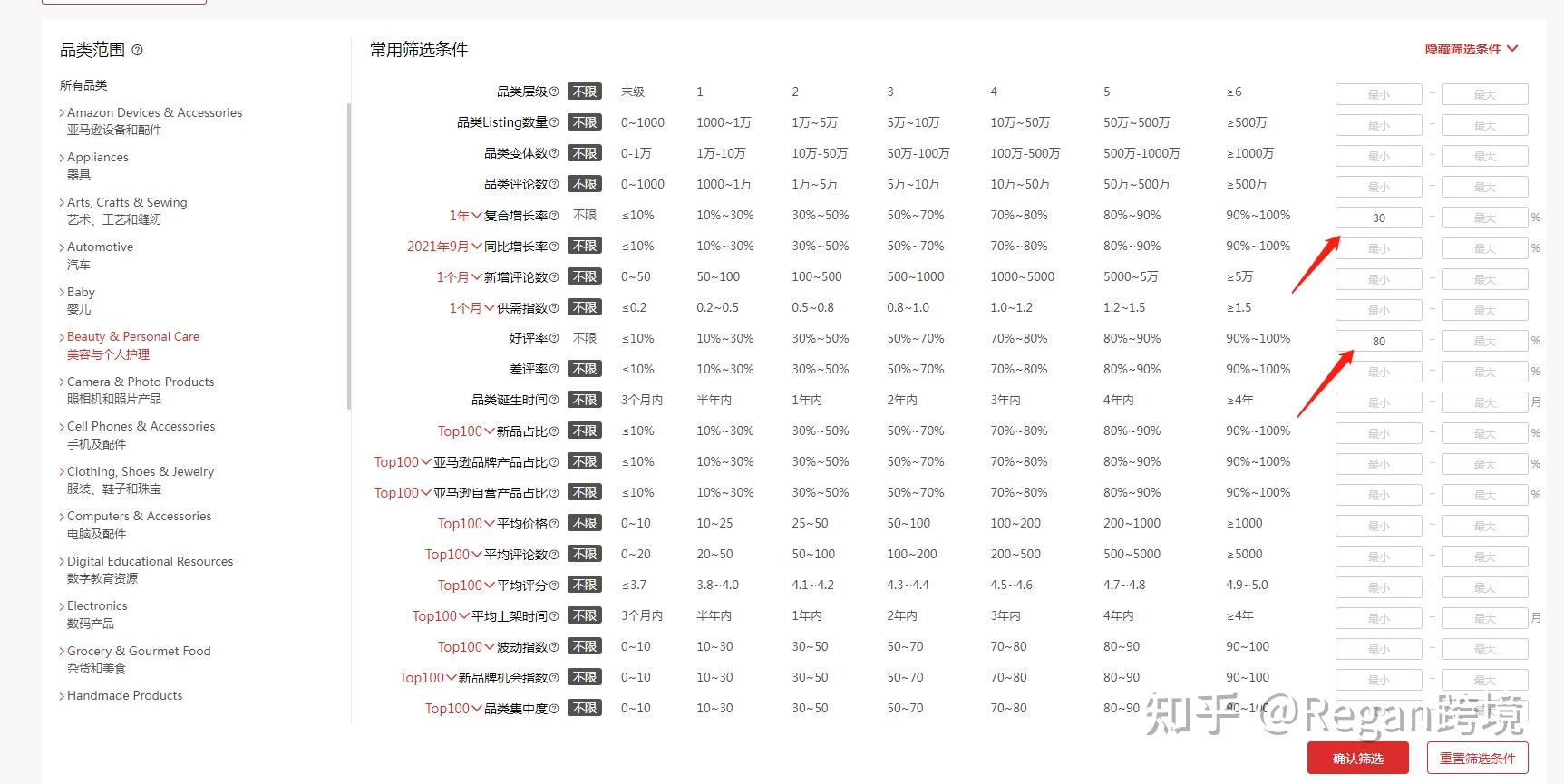 可以看一下, 首先确定我们要做的大类目是什么。然后根据条件进行筛选。比如我们想选择一个比较小众的市场,那么我们就需要设置整个类目的listing数量不能太多。并且年度的增长率要有(不能做一些夕阳产业)。 其次比较重要的一点是我们一定要看整个类目的评价情况。如果整个类目的评价星级相对来说都比较低,那么就证明这个产品有不可修复的产品痛点,这样的产品我们不要轻易的去做。