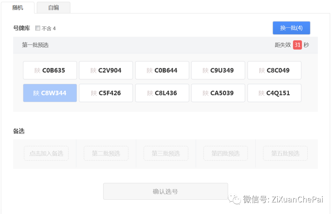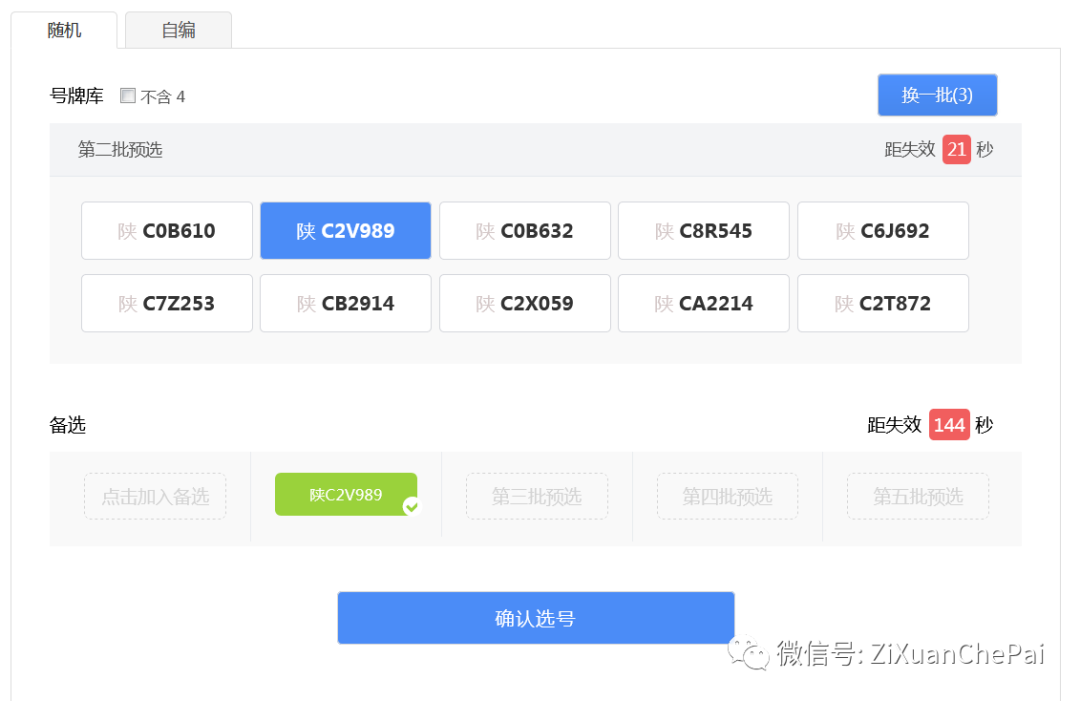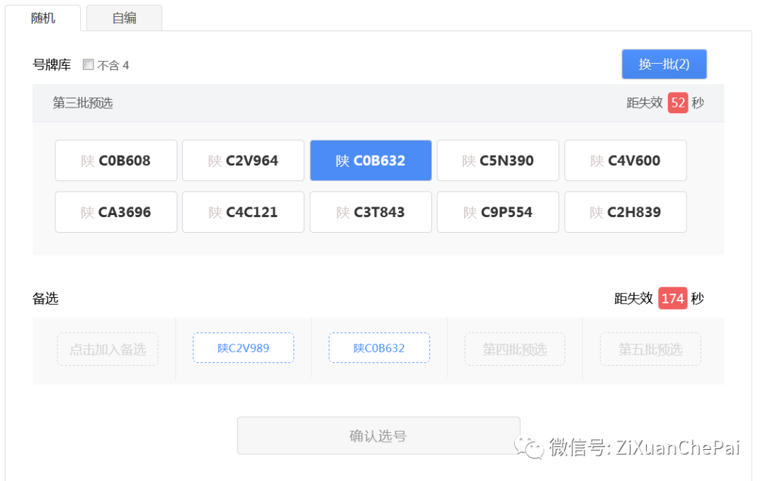 用户可以点击右上角“换一批”按钮重新进行随机(“换一批”后面的括号中的数字为用户当前选号车辆的剩余随机选号次数),此时会更新随机号牌栏中的号牌。如果备选号牌栏中的有号牌并且没有失效,则备选栏中的倒计时将重新开始倒计时。用户可以在新随机的号牌号码中选择一个号牌号码作为备选号牌,此时备选栏中的倒计时也将重新开始倒计时。如下图所示。如此循环操作,用户每次随机选号,都可以从随机号牌中选择一个号牌号码作为备选号牌,直到随机选号次数用完。