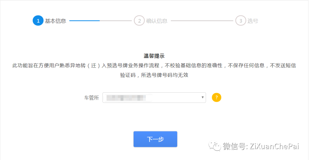 第一阶段(【步骤1:基本信息】→ 【步骤2:确认信息】→ 【步骤3:选号服务说明】)→ 第二阶段( 【步骤1:身份验证】→ 【步骤2:预选号牌】→ 【步骤3:完成号牌预选】)