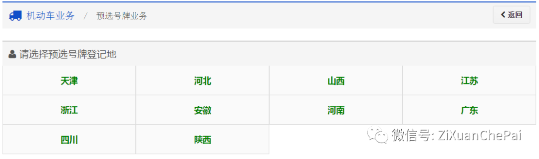 点击预选号牌服务说明页面中红色标示的“跳转到其他省市”链接,进入全国省市互联网服务平台选择界面。用户根据本人新购二手普通小型汽车需要上牌的车管所选择相应的省市,系统会自动跳转到用户选择的省市互联网服务平台的预选号牌首页。如下图所示: