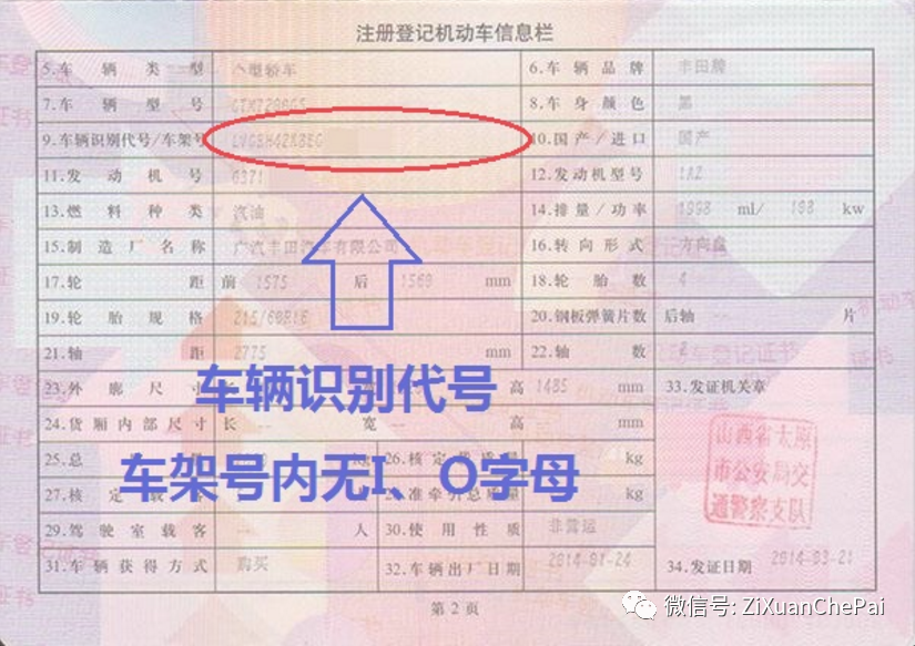 如果用户不明白车辆识别代号的概念,点击“?”按钮,会弹出车辆识别代号的说明。如下图所示,图片的箭头指示位置为《机动车登记证书》中车辆识别代号的说明。