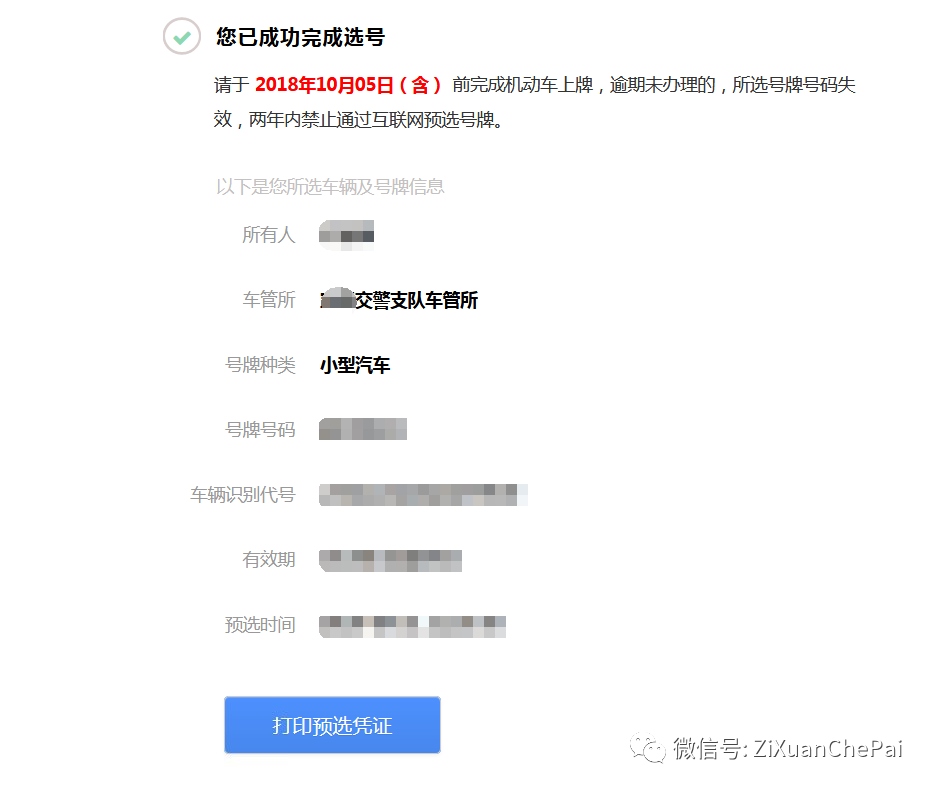 如果自编号牌验证通过,系统将自动确认号牌,用户即完成预选号,进入第二阶段步骤3【完成号牌预选】。