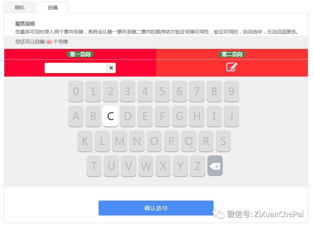 用户对多次随机的号牌号码不满意,并且还拥有自编选号机会,可点击“自编”Tab页跳转到自编选号操作页面。