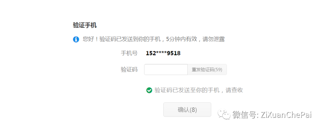 在该步骤,用户须获取并录入手机短信验证码,验证预选号牌的手机号码。用户须获取并录入手机短信验证码后,待界面底部“确认”按钮倒计时结束,点击验证手机短信验证码是否正确,验证通过进入第二阶段步骤2【预选号牌】。如下图所示: