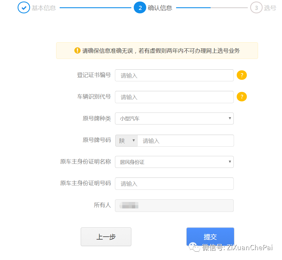 在该步骤,用户需要录入新购二手小型汽车的登记证书编号、车辆识别代号和卖方信息,如下图所示: