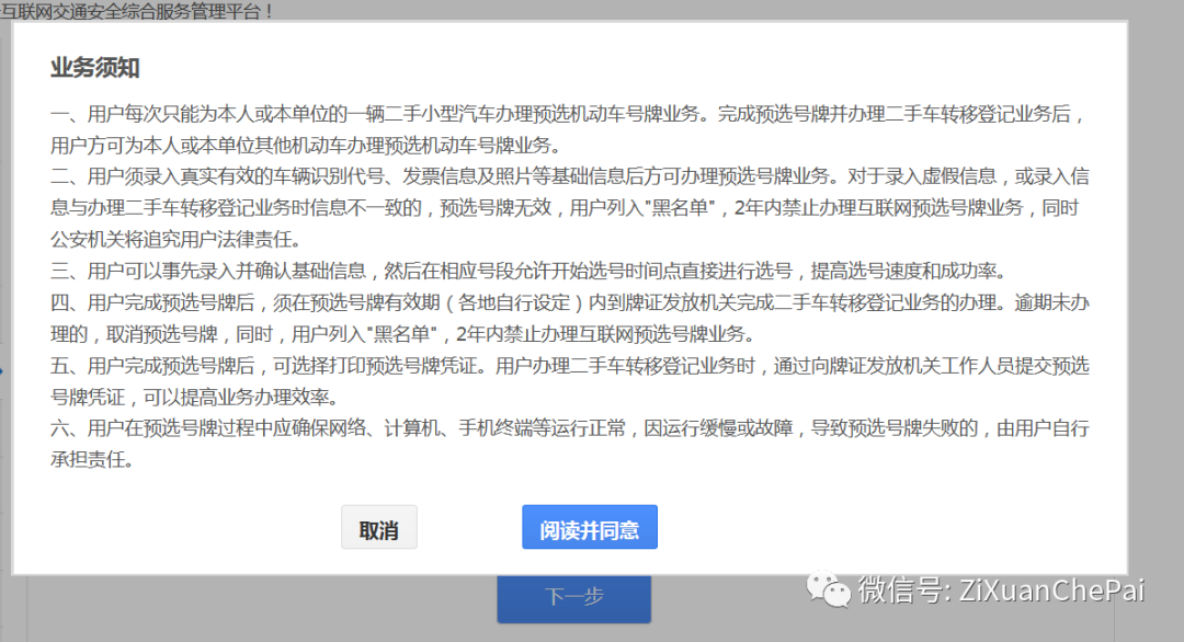 点击上图中的【下一步】按钮时,系统会弹出业务须知的对话框,界面如下图所示,业务须知具体内容由各地自行维护,下图只是示例,不代表本平台选号的业务须知内容。请用户在预选号牌时务必仔细阅读业务须知,了解业务相关规则。用户点击对话框中的【阅读并同意】按钮进入第一阶段步骤2【确认信息】步骤。