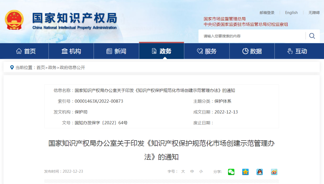 国家知识产权局办公室关于印发《知识产权保护规范化市场创建示范管理办法》的通知各省、自治区、直辖市和新疆生产建设兵团知识产权局:现将《知识产权保护规范化市场创建示范管理办法》印发给你们,请结合实际认真贯彻落实。国家知识产权局办公室2022年12月13日知识产权保护规范化市场创建示范管理办法第一章  总则第一条 为了贯彻落实中共中央、国务院印发的《知识产权强国建设纲要(2021—2035年)》和国务院印发的《“十四五”国家知识产权保护和运用规划》决策部署,落实中共中央办公厅、国务院办公厅印发的《创建示范活动管理办法(试行)》工作要求,做好纳入第三批全国创建示范活动保留项目的管理工作,加强商品交易市场知识产权保护和管理,促进线上线下市场融合发展,营造公平竞争的市场环境,制定本管理办法。第二条 本办法所称知识产权保护规范化市场是指已批准纳入知识产权保护规范化市场创建名单的商品交易市场,通过重点培育建设,经国家知识产权局认定,在推动提升市场相关方知识产权保护意识和管理能力,促进商品交易市场建立知识产权保护长效机制等方面具有示范标杆作用的国家级知识产权保护规范化市场。第三条 知识产权保护规范化市场创建示范工作以促进知识产权有效保护和规范管理为目标,每年培育认定一批线上线下知识产权保护规范化市场,示范带动更多市场主体加强知识产权保护管理工作,提高消费者满意度,打造市场化、法治化、国际化营商环境。第四条 知识产权保护规范化市场创建重点开展以下工作任务:指导市场经营管理主体建立知识产权保护工作机制,完善知识产权保护工作体系,提高知识产权保护管理能力,强化知识产权保护意识,提升知识产权保护满意度。第五条 国家知识产权局负责统筹指导知识产权保护规范化市场的培育指导、认定和复查工作。各省(区、市)知识产权局负责本地区市场的推荐、日常管理、具体指导和认定初评工作。第六条 知识产权保护规范化市场创建示范工作按照自愿申报、择优推荐的原则开展,包括培育申报、评价认定、资格复查、动态管理等程序。第七条 各类符合条件的线上线下商品交易市场均可申报参与培育工作;已参与知识产权保护规范化市场培育工作的市场培育期满后可申请认定;已认定及2022年之前通过续延审查的国家级知识产权保护规范化市场均需参与复查工作。第八条 国家知识产权局对知识产权保护规范化市场创建对象给予政策支持、工作指导、培训引导等措施。第二章  实施程序第一节  申报培育程序第九条 知识产权保护规范化市场培育申报条件主要包括以下方面:(一)申报主体应当具有独立法人资格,其经营管理的线下商品交易市场应具有固定经营交易场所。线上商品交易市场应为符合《电子商务法》规定的电子商务平台;(二)在市场所在区域或所在行业具有较大规模及影响力(包括市场规模、年度成交额、经营者数量等);(三)具有知识产权保护基本管理制度,市场相关方知识产权保护意识较强;(四)申报主体能够为知识产权保护提供人员、经费、信息等方面资源和支持。第十条 各省(区、市)知识产权局根据国家知识产权局发布的通知,负责知识产权保护规范化市场培育申报推荐工作,指导符合条件的申报主体自愿申报,并填写培育申报材料。第十一条 培育申报材料包括:(一)知识产权保护规范化市场培育申报表;(二)知识产权保护相关管理制度证明材料;(三)知识产权保护管理成果证明材料;(四)其他必要的说明材料。第十二条 申报材料由线下商品交易市场所在区域、线上商品交易市场注册地所在区域省(区、市)知识产权局进行审核,在符合申报要求基础上,同等条件下优先推荐保护基础好、保护需求强、保护能力好、保护意识强,在制度规范、管理机制、宣传保障等方面工作成效突出的商品交易市场,并按规定将申报材料报送国家知识产权局。对于既有线下实体、又有线上平台的商品交易市场,应由线下市场所在区域省级知识产权局负责。第十三条 国家知识产权局对各省(区、市)申报材料进行审核,并组织专家评审,根据申报材料及评审意见,综合考虑市场影响力、经销商品或主营产业的知识产权类型、侵权行为的易发性以及各地实际工作基础,兼顾东中西部发展平衡,遴选确定培育市场名单,批准符合条件的市场开展培育工作。第十四条 培育期原则上为1年。各省(区、市)知识产权局应当加强具体指导和日常管理。批准培育后,省级知识产权局指导各市场制定工作计划并报送国家知识产权局,按照工作计划在培育期间内达到认定考评指标要求。第二节  认定程序第十五条 申请认定知识产权保护规范化市场的条件:(一)市场经营管理主体知识产权保护目标和方针明确,已制定知识产权保护管理规章制度;(二)已建立或明确知识产权管理机构,配备熟悉知识产权业务的专兼职工作人员;(三)已建立并有效实施经营管理过程中的知识产权保护制度,包括但不限于商品信息管理制度、商品日常检查管理制度、诚信管理制度、侵权处理制度、先行赔付制度等;(四)与知识产权行政机关或司法机关建立协查协作机制,能够及时配合相关部门开展知识产权管理、执法工作。(五)已建立知识产权保护水平评价和改进制度。第十六条 申请