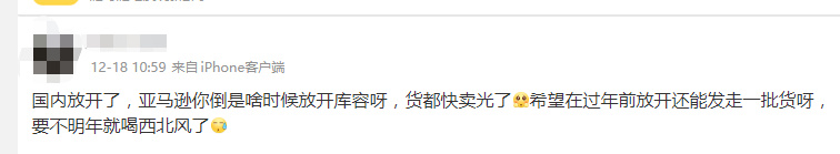 现在的状态虽然是国内政策放开了,但是亚马逊没有库容,很多人都发不了货,对此,有卖家表示:“国内放开了,亚马逊你倒是放开库容呀,货都快卖光了,希望在过年前放开还能发走一批货呀,要不明年就喝西北风了!”