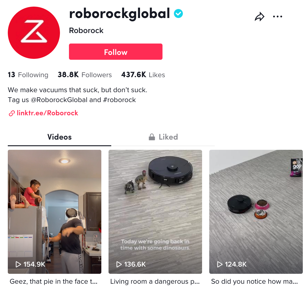 大概在一年多之前,Roborock开始着力经营其TikTok主账号roborockglobal。帖子虽然发的频率还不是那么高,但一年时间左右,积累了近4万粉丝,43万点赞,成绩算是不错的。