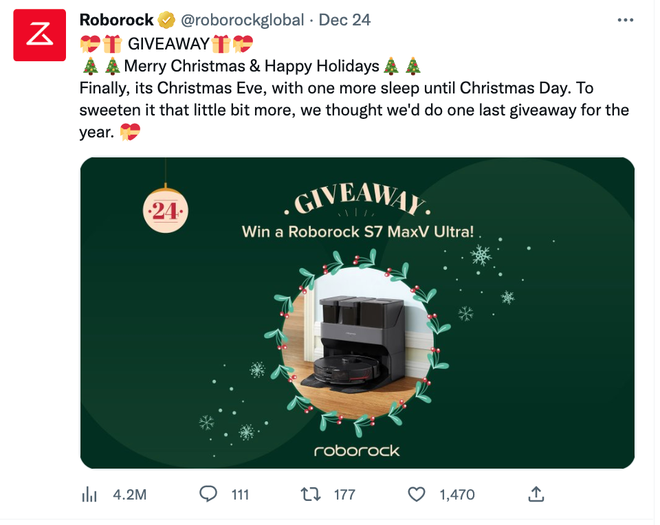 在推特上,Roborock也玩得越来越上道。在刚刚过去的圣诞节,Roborock在推特上做了一个“产品赠送”获得,吸引粉丝转发。这个活动数据非常成功,单个帖子活动1470个点赞,177个转发,浏览量达到420万次。