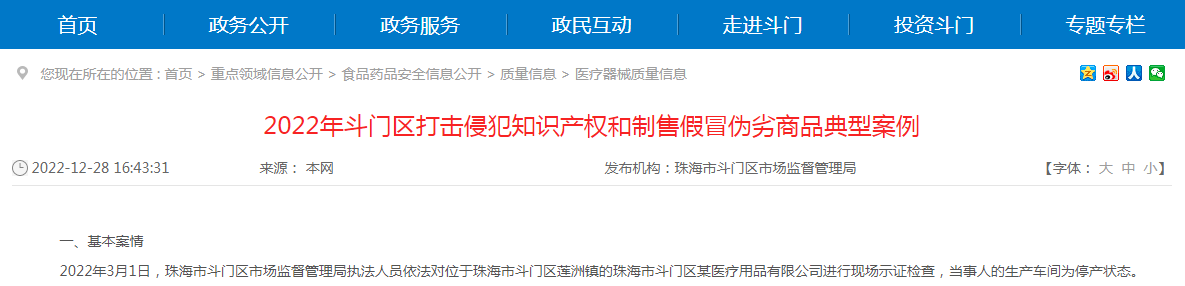 中国质量新闻网讯 近日,珠海市斗门区市场监督管理局发布2022年斗门区打击侵犯知识产权和制售假冒伪劣商品典型案例。具体信息如下: